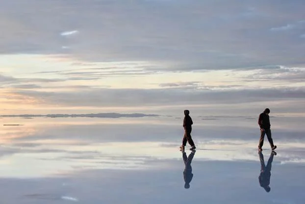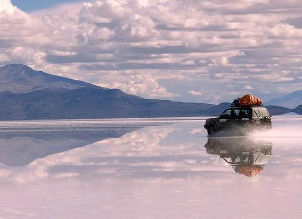 雨季時,烏尤尼鹽沼會形成一個淺湖。由於水淺,湖面就像鏡子一般,反射著美麗的天空景色,呈現無邊無際的「天空之鏡」。